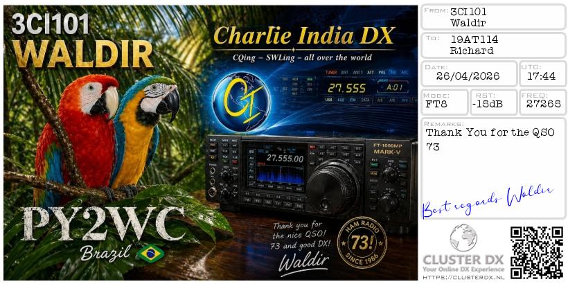 Mr. Waldir, thank you for your e-QSL, It was nice working you in these poor propagations on FT8.
