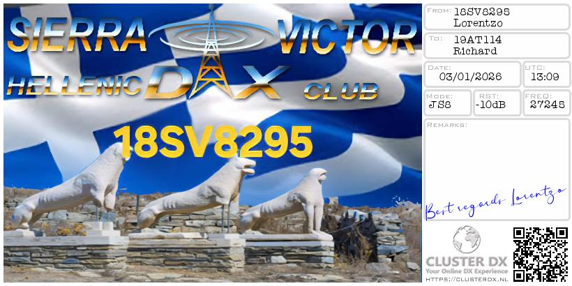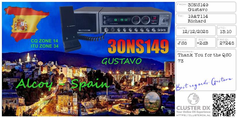 Hello Gustavo, thanks for your e-QSL, Feliz Navidad y un próspero año nuevo.